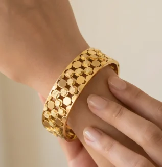 This gold plated bracelet is crafted from premium metal and finished with a high-quality, long-lasting coating that helps maintain its shine over time. The surface is smooth, skin-friendly, and comfortable for all-day wear, making it ideal for regular use. To preserve its beauty, gently wipe it with a soft, dry cloth after each use. Store it in an airtight box or pouch to protect it from moisture. Avoid contact with perfumes, lotions, sweat, and harsh chemicals, as they may reduce the shine. Handle with care and keep away from sharp objects to prevent scratches.
