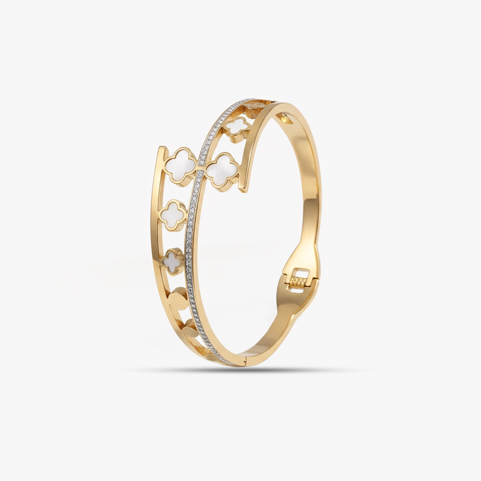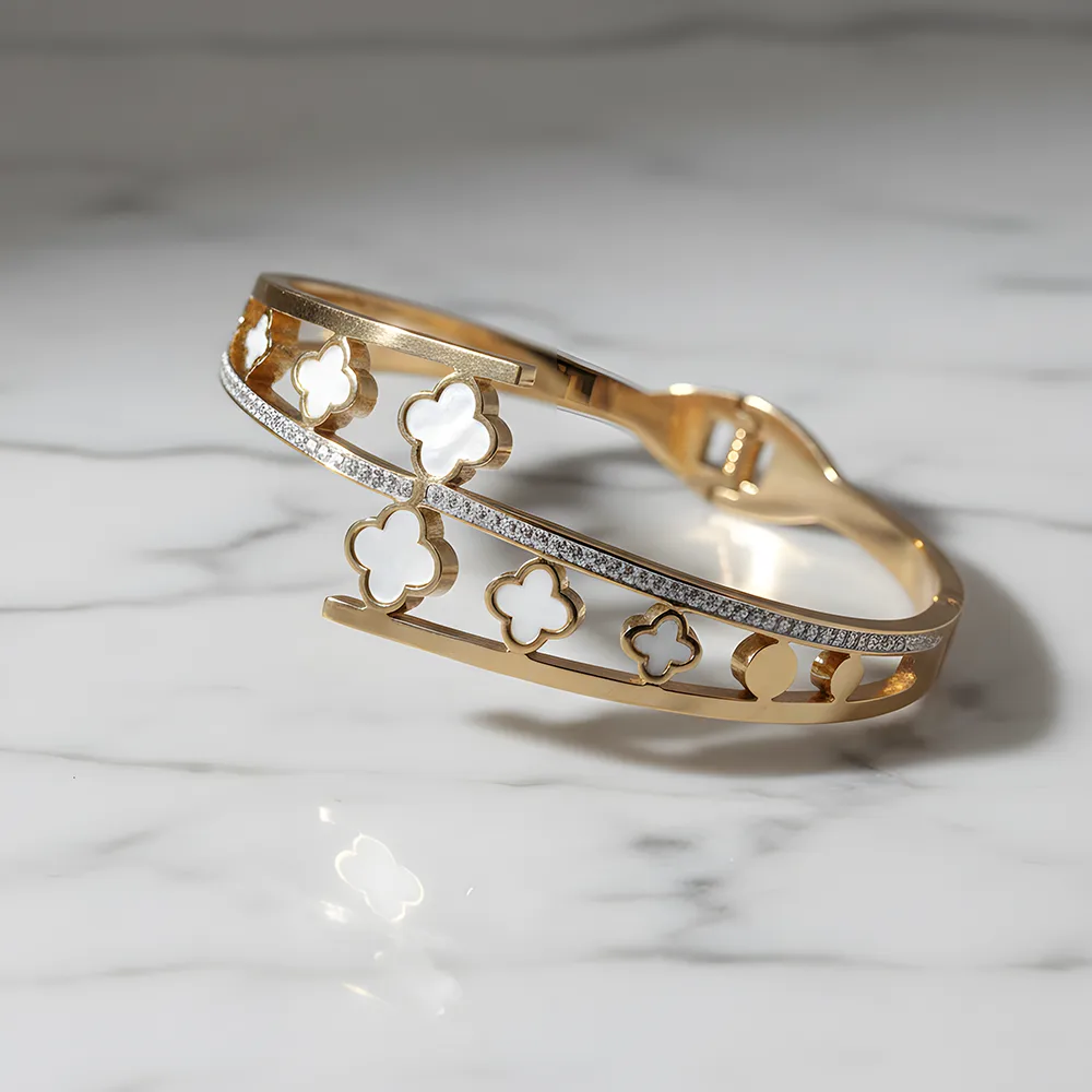 Royal White Clover Gold Bracelet for Women with Sparkling Diamond Line